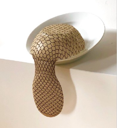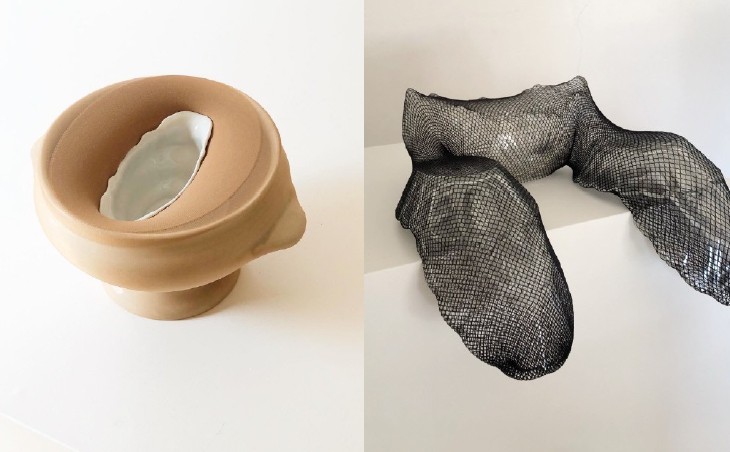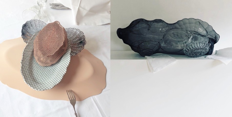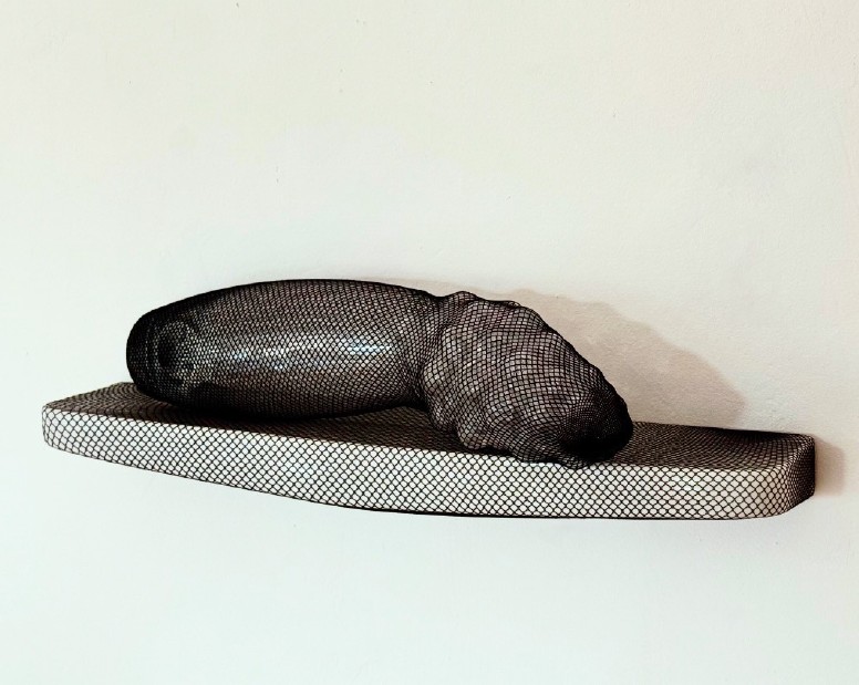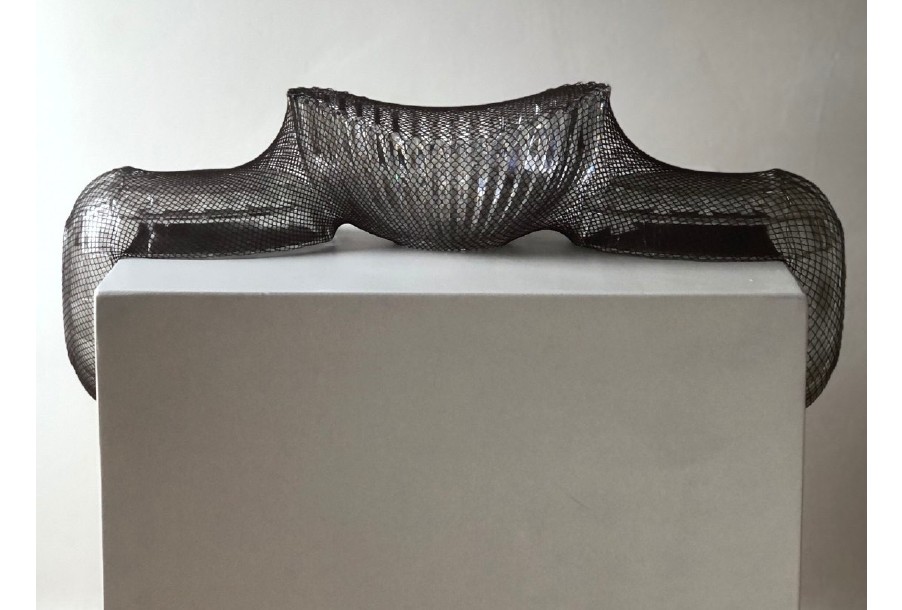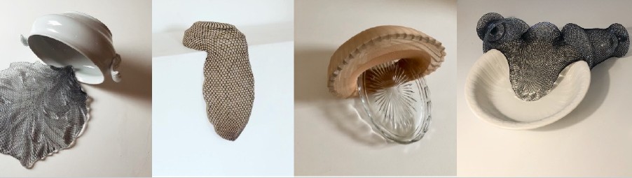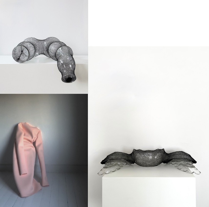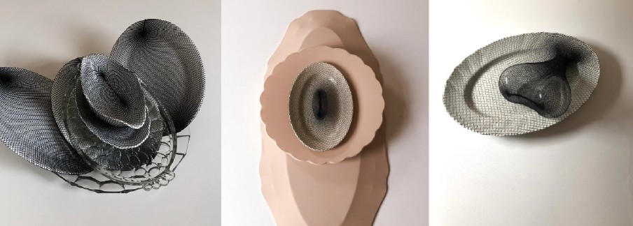 La résille comme trame souple le textile comme syntaxe la suspension comme état le geste comme soin et comme retenue Le vide comme forme le verre, fragile, transparent et creux l a tension entre structure et effondrement l’absence de figure l’échelle du corps